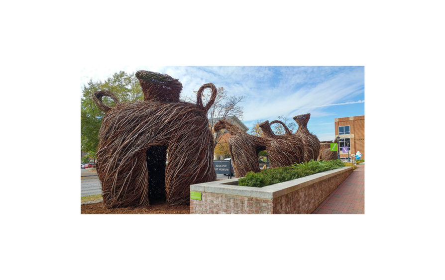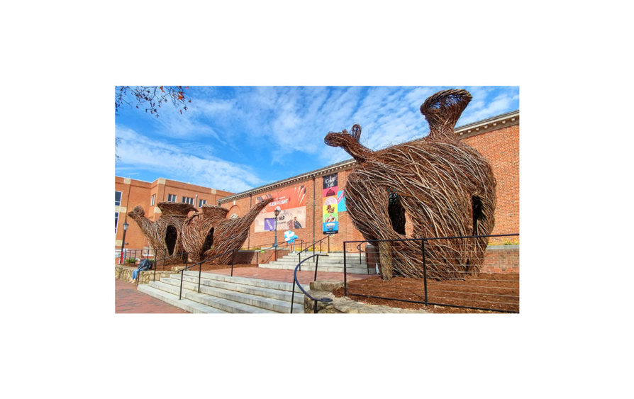 Connu pour ses sculptures monumentales réalisées avec des morceaux de bois (« stickwork » en anglais), l’artiste américain Patrick Dougherty a été invité par le Ackland Art Museum (États-Unis) à créer une œuvre in situ face à l’entrée du musée. Des milliers de branches de jeunes arbres ont été cueillies dans des espaces verts de la ville par l’artiste et une équipe de bénévoles, qui ont soigneusement dépouillé les rameaux de leurs feuilles et ont aidé à la réalisation de l’installation.