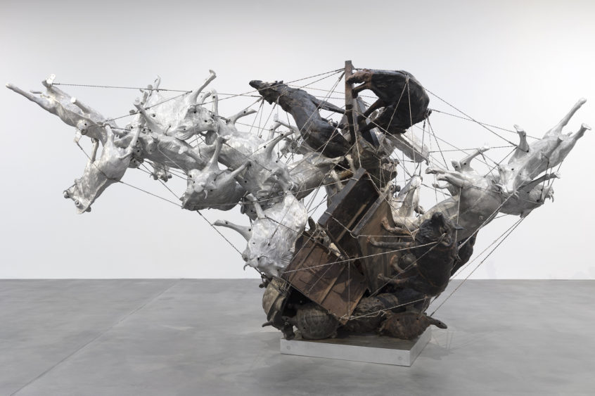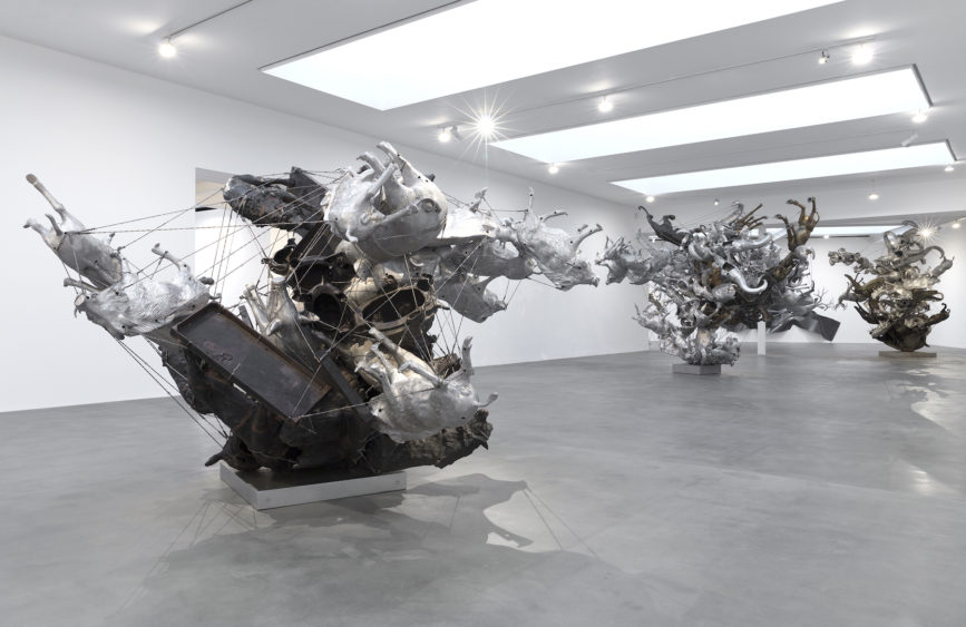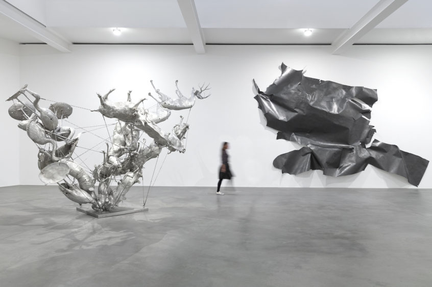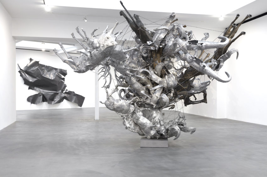 Les sculptures de Nancy Rubins ne peuvent pas passer inaperçues. Pas uniquement pour une question de dimensions, souvent imposantes, mais surtout pour l’impact visuel et émotionnel qu’elles suscitent. Assemblages verticaux de formes et de matériaux divers, ses sculptures habitent l’espace comme si l’artiste avait créé un équilibre miraculeux. Les sculptures présentées à la galerie Gagosian de Londres ne font pas exception et défient elles aussi la force de gravité. Diversifolia, terme botanique indiquant le développement du feuillage d’une plante, fait ici référence au mouvement et aux directions des éléments qui composent ces sculptures. Girafes, tortues, crocodiles, loups et cochons en acier, bronze, cuivre et aluminium, sont suspendus dans l’espace à l’aide de cables et s’enlacent magistralement.