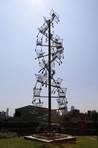 A quelques pas se trouve DNA DL90 d’Abigail Fallis, une sculpture composée de 22 caddies de supermarché disposés en forme de double spirale. A l’origine, cette œuvre avait été commissionnée pour une chaîne de supermarché en commémoration du 50ème anniversaire de la découverte, par le biologiste américain James Watson et le physicien anglais Francis Crick, de la structure en double spirale de l’ADN, basée sur les images de diffraction par rayons X. Leurs découvertes ont joué un rôle fondamental dans la compréhension de la dystrophie musculaire, une maladie sur laquelle cette commission veut attirer l’attention du public.