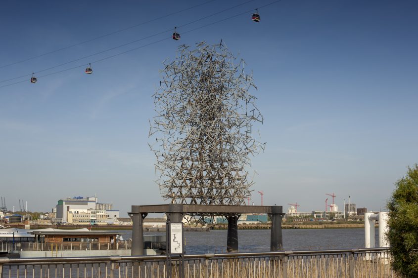 A Bullet from a Shooting Star, de l’artiste britannique Alex Chinneck, est une œuvre monumentale, fruit d’une collaboration entre la Péninsule de Greenwich et le London Design Festival. Cette sculpture ressemble à un pylône électrique renversé, hommage à l’histoire industrielle de Greenwich où se trouvait l’une des plus grandes usines à pétrole et à gaz d’Europe. Cette structure en treillage d’acier s’élève à 35 mètres de haut et est composée de 466 pièces d’acier soudées ensemble.