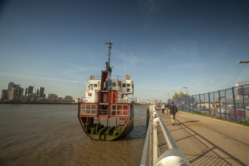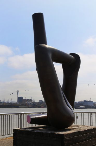 De l’autre côté de la Tamise, sur les Royal Docks, les visiteurs se trouvent nez-à-nez avec l’œuvre poignante de l’artiste américain Sterling Ruby. Consolidator #654321 fait partie d’une série de Consolidators que Ruby a fabriqués à partir de différents matériaux. Ces œuvres font penser aux traditionnels monuments « canons » qu’on trouve souvent sur les sites historiques et anciens champs de bataille, ici transformés par Ruby en forme de cercueil. Consolidator #654321 est fait d’aluminium utilisé sur les chantiers navals et tire son titre du code hexadécimal correspondant à sa couleur.