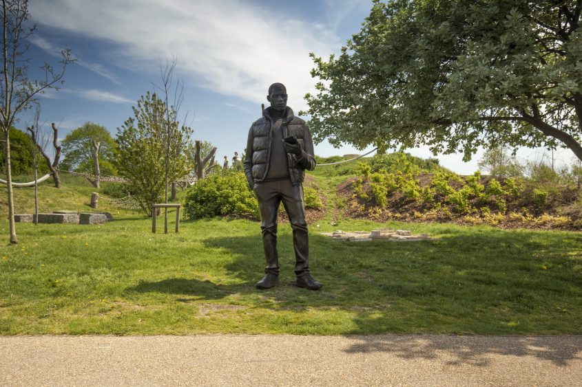 L’œuvre suivante est de Thomas J Price et intitulée Network. Comme beaucoup des œuvres de Price, cette sculpture figurative partage sa fascination pour les individus, le langage corporel et les expressions, et explore les modes classiques de l’art occidental et de son propre héritage Jamaïcain. Cette sculpture, qui est la plus grande qu’il ait réalisée jusqu’ici, représente un gigantesque jeune homme, absorbé par son téléphone portable. Un portrait contemporain qui attire l’attention sur notre dépendance croissante à ces petits appareils qui nous fascinent.